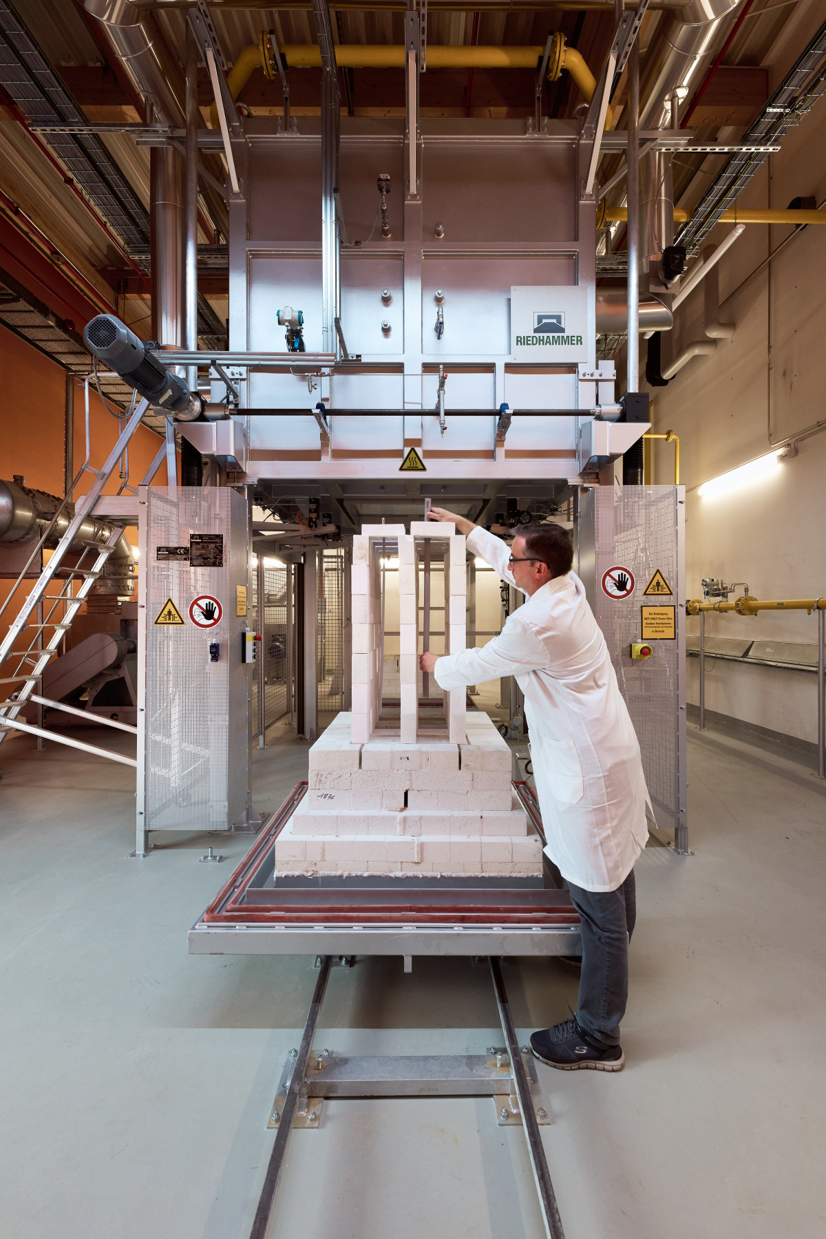 The furnace chamber and temperature distribution remain identical regardless of the firing gas. Only the five burner heads need to be exchanged, ensuring optimum comparability when evaluating the potential impact of a fuel switch on product properties. The elevator-hearth sintering furnace has a capacity of 500 liters, making it ideally suited to field trials that can ultimately be scaled directly to industrial furnaces. Achieving temperatures of up to 1,700 °C, it has an installed power of 1,000 kW and can process up to 150 kilograms of material per firing cycle.